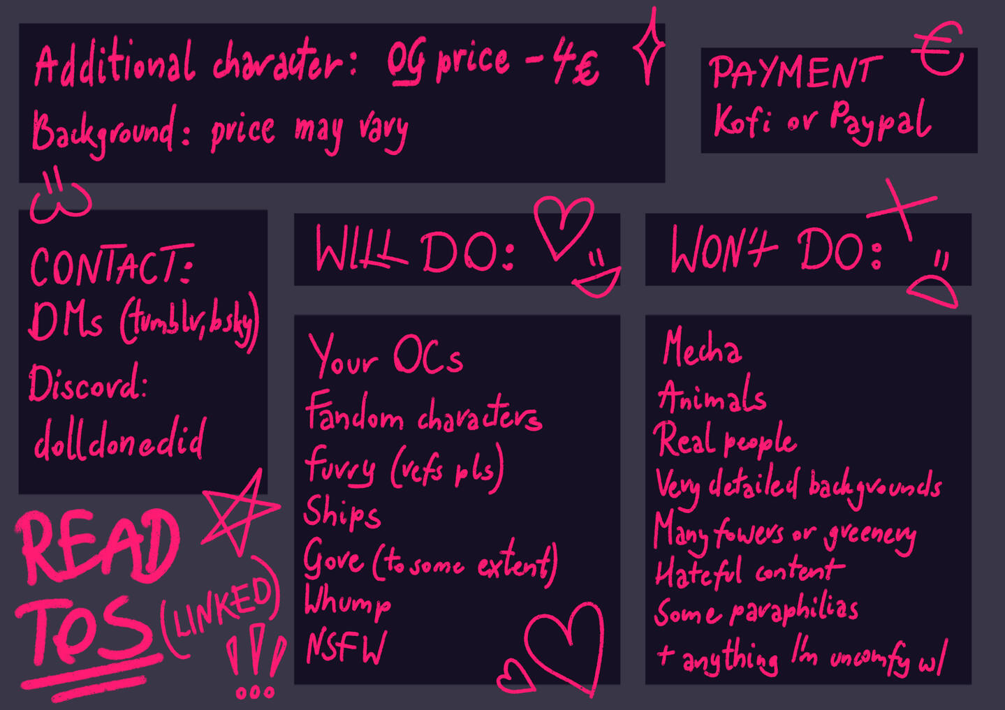 - Where to contact you for a commission, and where will you be sending updates while working?In dms on any social media platform (Tumblr, Bluesky) or on Discord: dolldonedid- Will you draw [insert a thing not specified earlier]?Don't be afraid to ask me, I promise I don't bite.- Why are your prices so low? (Or at least in comparison to some other commissions)First of all, I am fast at drawing and don't have a very detailed artstyle.